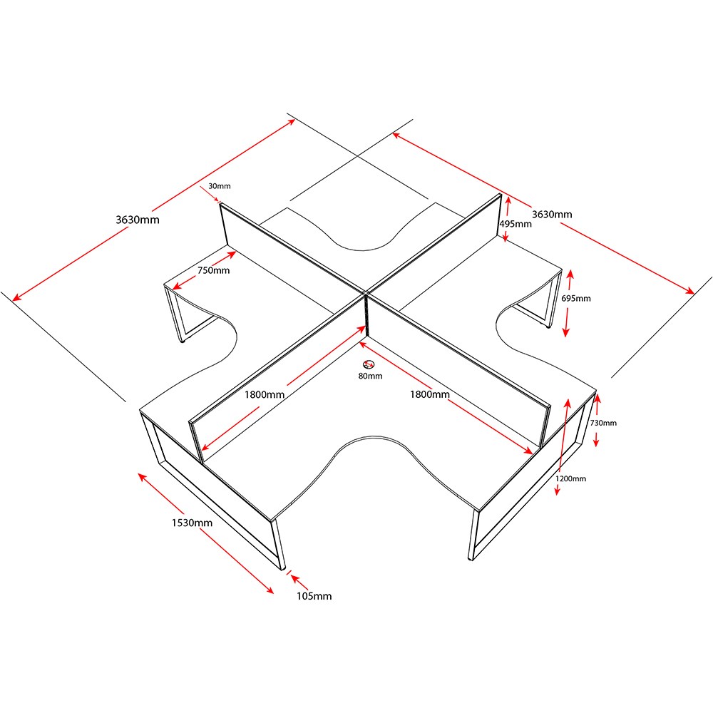 • Overall Including Screen: 3630mm W x 3630mmW x 780mm D x 1200mm H. Per User: 1800mm W x 1800mmW x 750mm D. Desk Height: 730mm.