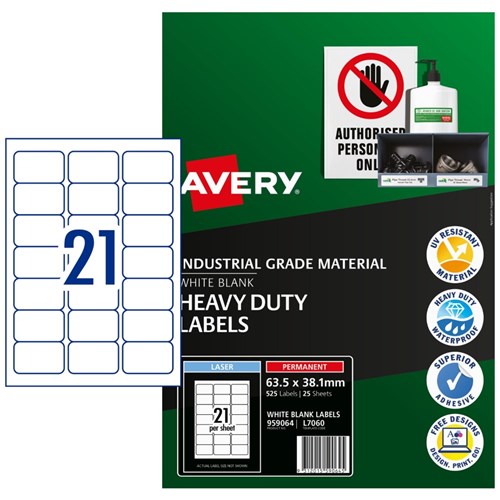 AVERY L7060 DURABLE H/D LABEL Laser 21/Sht 63.5x38.1mm Wht PK 525
