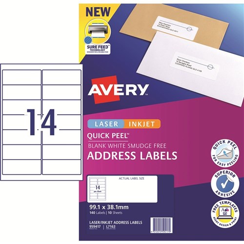 Avery Quick Peel Address Laser & Inkjet Label L7651 99.1x38.1 White 140 Labels, 10 Sheets