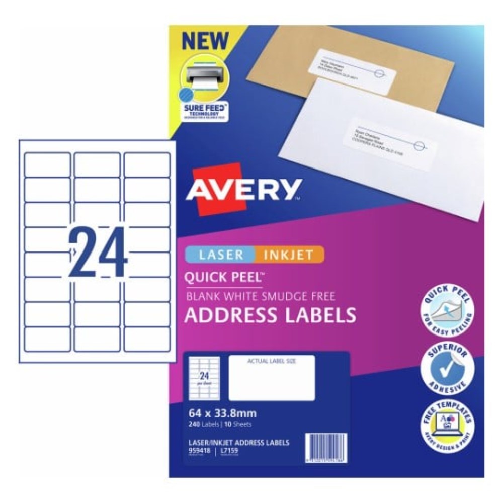 Avery Quick Peel Address Laser & Inkjet Labels L7159 64x33.8 White 240 Labels, 10 Sheets