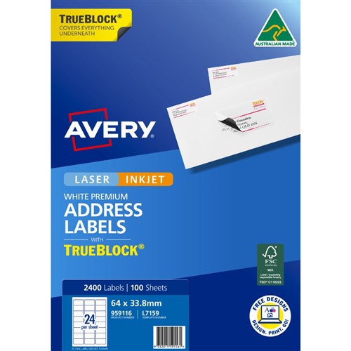 Avery Trueblock Address Labels Laser L7159 64 x 33.8mm 24UP 2400 Labels