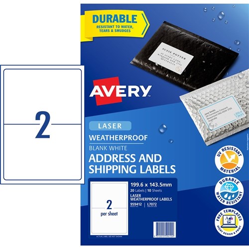 Avery Weatherproof Shipping Laser Label L7072 199.6x143.5 White 20 Labels, 10 Sheets