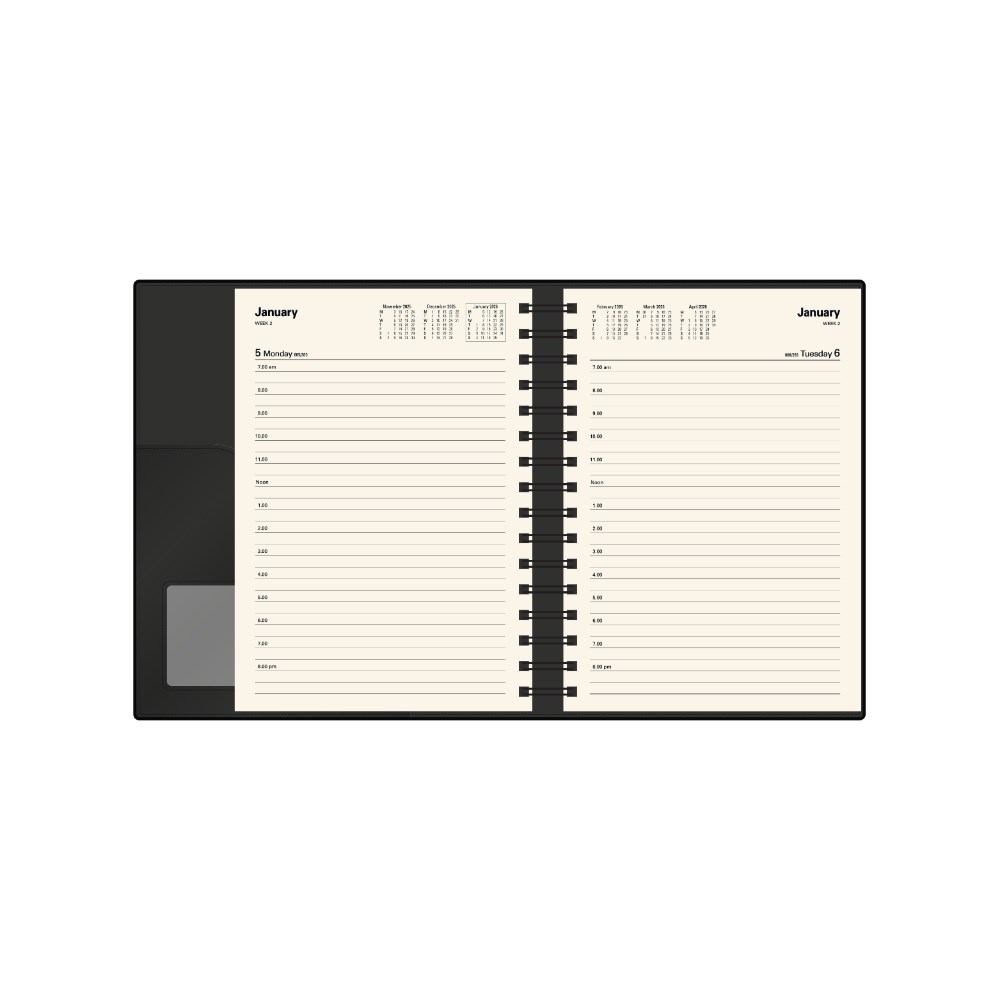 • Pen loop, lay flat opening, ribbon marker, vertical week to view layout.