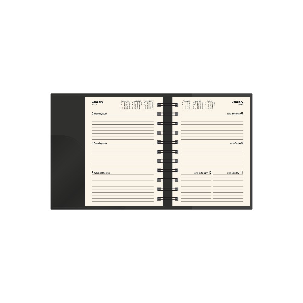 • Pen loop, lay flat opening, ribbon marker and week to view layout.