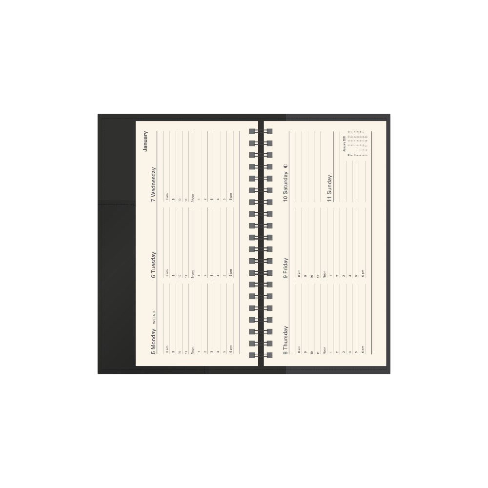 • Printed on a subtle cream paper, each dated page layout features a six-month to opening calendar, week numbers, Julian days, as well as both national and international public holidays.