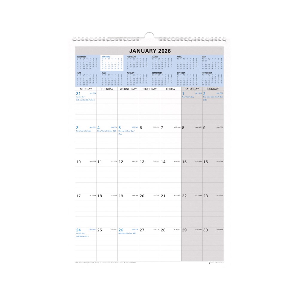 • Features: Australian and New Zealand Holidays Julian Days (Calendar Only) Shaded Saturday and Sunday.