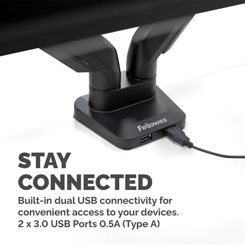 • Fully independent adjustable monitor arms, with 360 degrees rotation via innovative gas spring technology allowing for effortless movement.