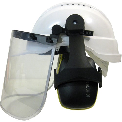 • Complete helmet, clear visor and earmuffs.