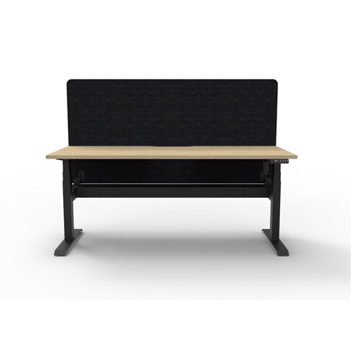 • Electric height adjustable single sided workstation with Natural Oak top and Black Satin frame, Black Eco screen and cable tray.