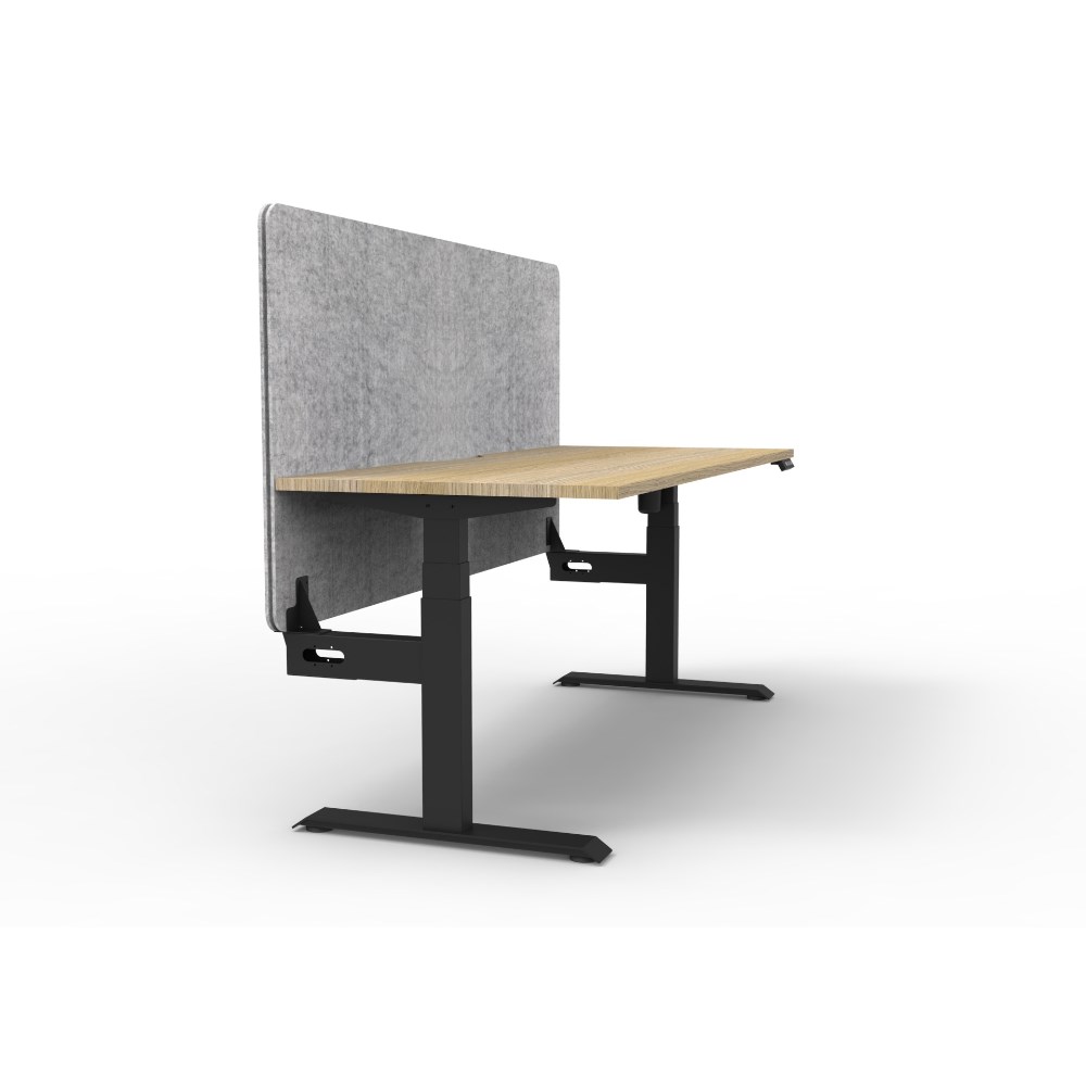 • Electric height adjustable single sided workstation with Natural Oak top and Black Satin frame, Grey Eco screen.