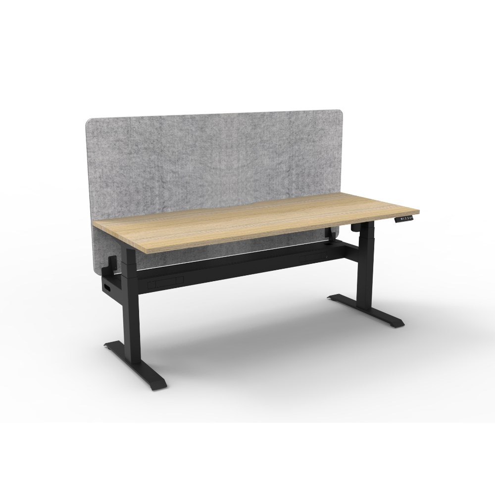 • Electric height adjustable single sided workstation with Natural Oak top and Black Satin frame, Grey Eco screen and cable tray.