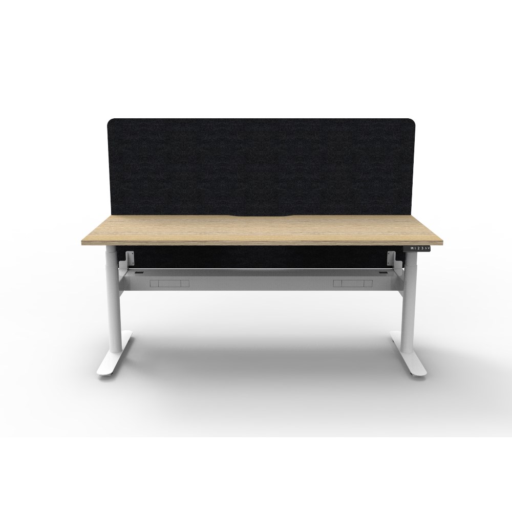• Natural Oak worksurface with rigid edging and 50mm scallop cable cut out. E0 rated 25mm top. White Satin powder coat round-leg frame. Eco screen and cable tray.