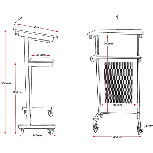 • The Rapidline Lectern is fully mobile with lockable castors, and is fitted with 2 shelves and a battery powered light for easy reading.