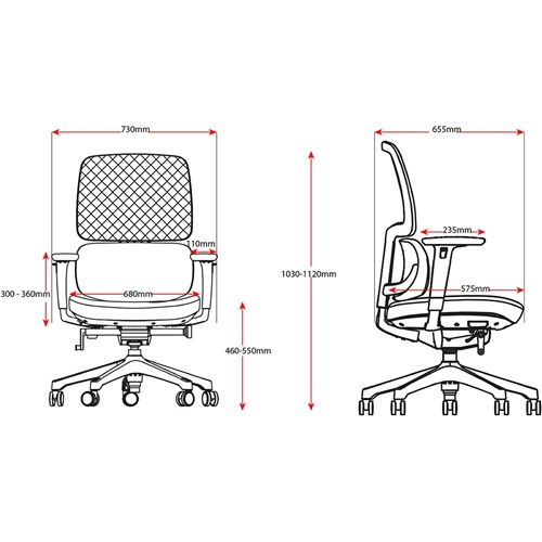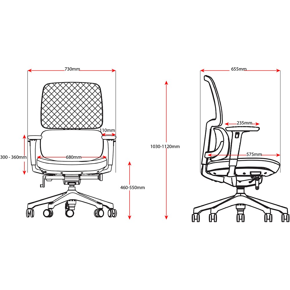 • Chair Dimensions: Seat 680W x 575D x Seat 460-550mmH. Overall height: 1030-1120mmH