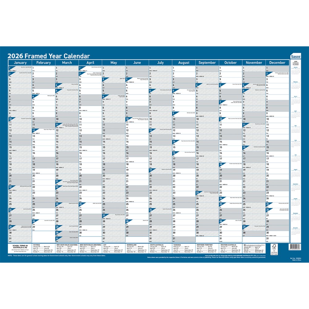 Sasco Framed Wall Planner 700 x 1000mm Year To View Blue