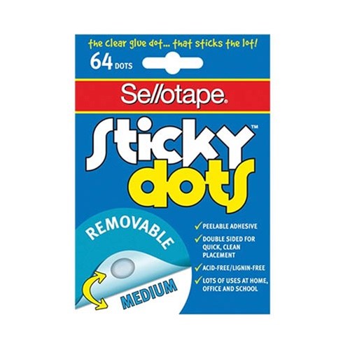 • Sticky Dots Removable is a clear, double-sided, strong, adhesive glue dot. It is easily removable, leaving no residues behind. Simply roll the dots off with your fingertips to remove.