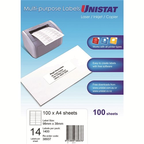 UNISTAT LASER/INKJET LABELS Copier 14/Sht 98x38mm BOX 1400