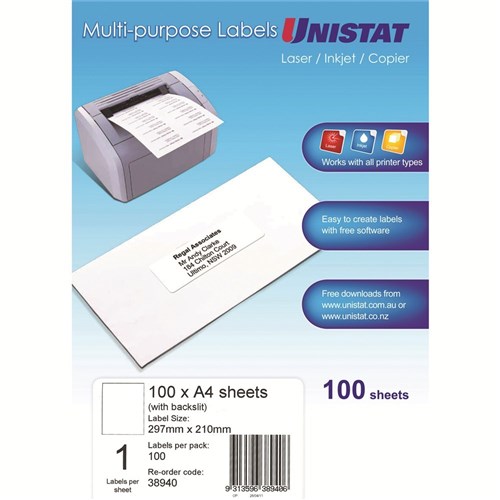 UNISTAT LASER/INKJET LABELS Copier 1/Sht 297x210(Back Slit BOX 100