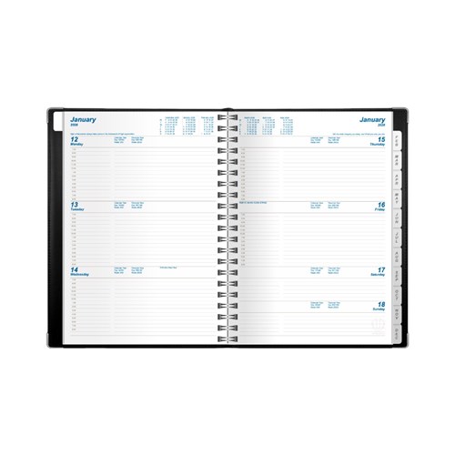 • Double wire binding. Lay flat opening. Ribbon marker. Tabs. Translucent pocket.