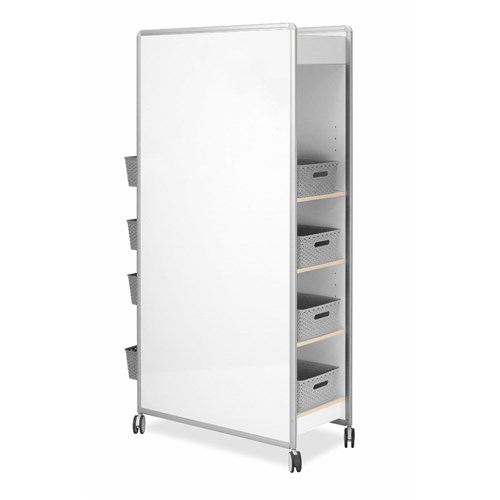 • Easily movable double sided magnetic whiteboard with storage that is split into two making it perfect for shared and adaptable learning environments.