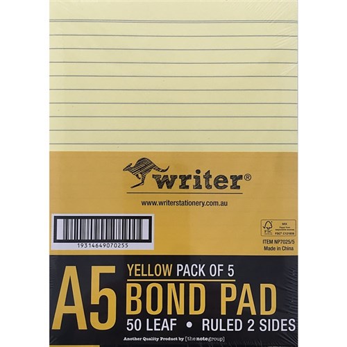 Writer A5 Premium Bond Pad 50 Sheet Ruled 2 Sides Yellow Pack Of 5 Ctn of 6
